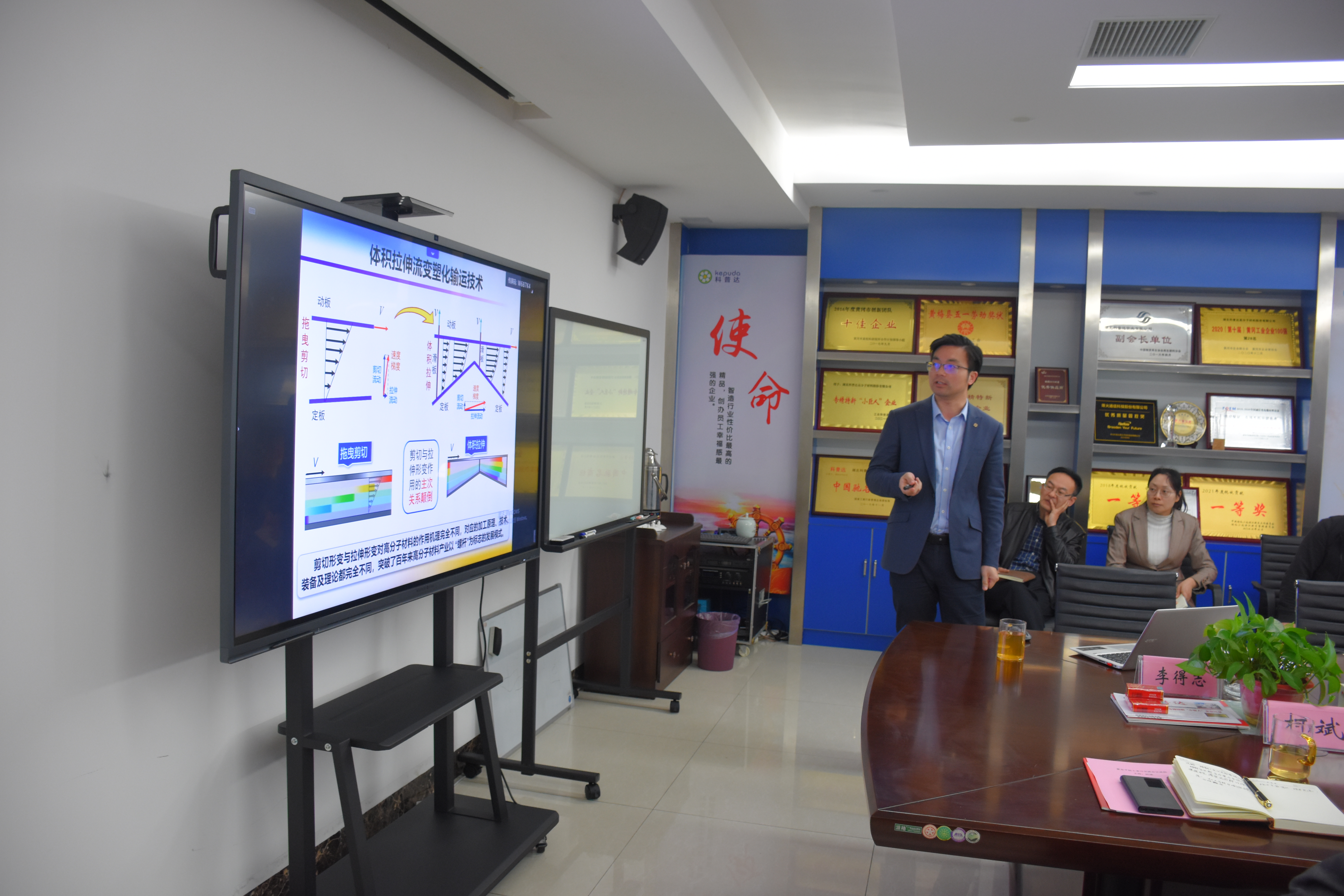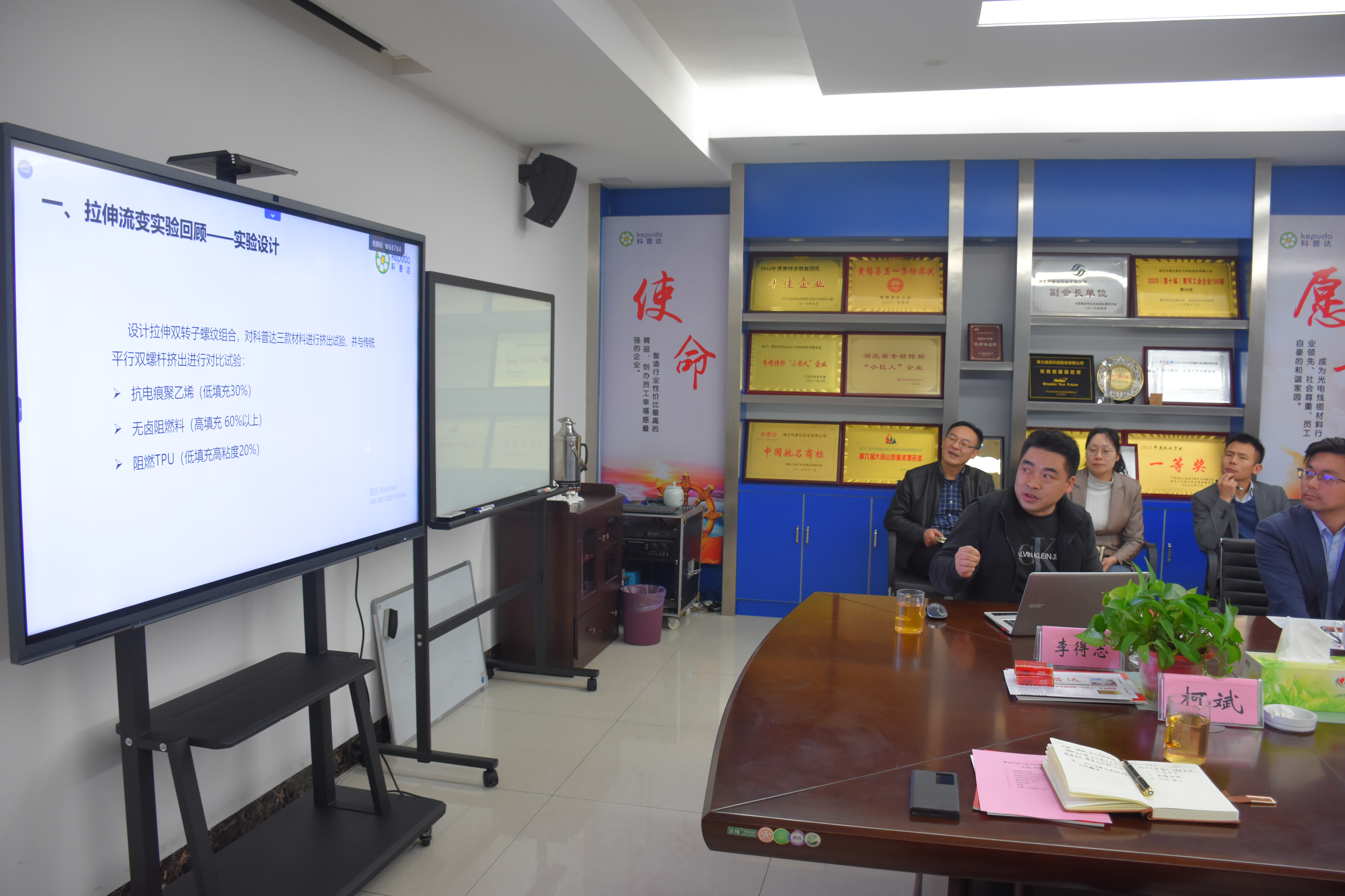 公司技術總工李得志匯報了前期與華南理工大學合作的拉伸流變技術的項目情況,在TPU彈性體加工上良好的表現(xiàn),加工產(chǎn)品性能優(yōu)異,但在高填充無鹵產(chǎn)品上面有待設備技術調整;并提出了相應的技術訴求,諸如密煉機轉子的改進、高填充材料的拉伸流變螺桿改進、自動上料系統(tǒng)的新方案等訴求。