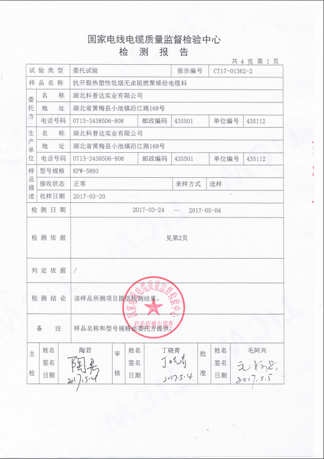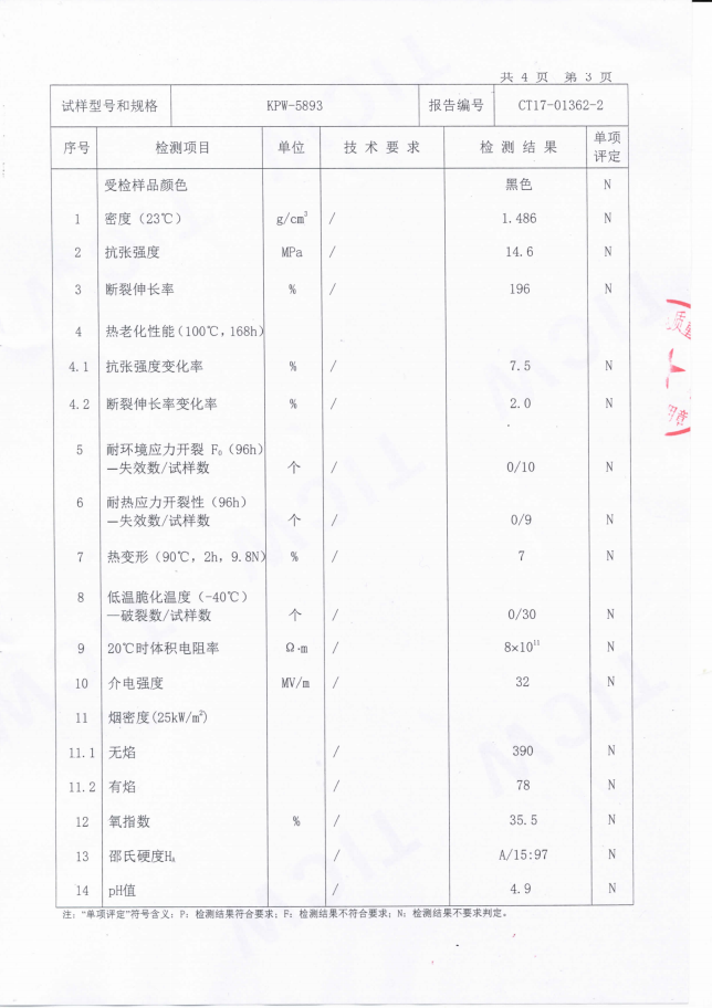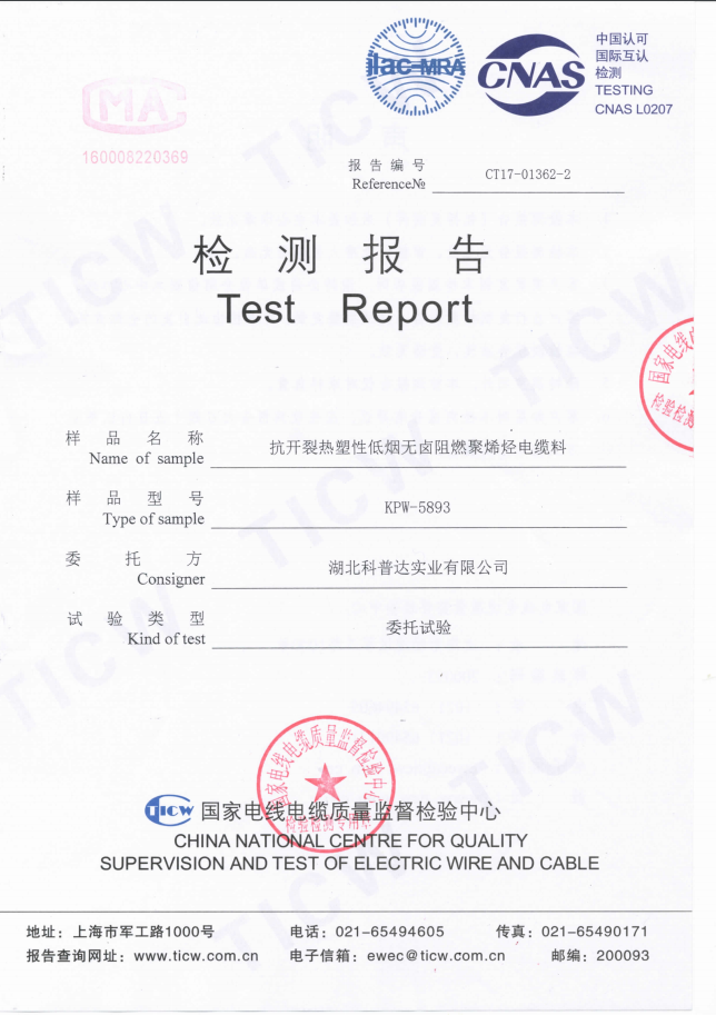 KPW-5893抗開裂熱塑性低煙無(wú)鹵阻燃聚烯烴電纜料檢測(cè)報(bào)告